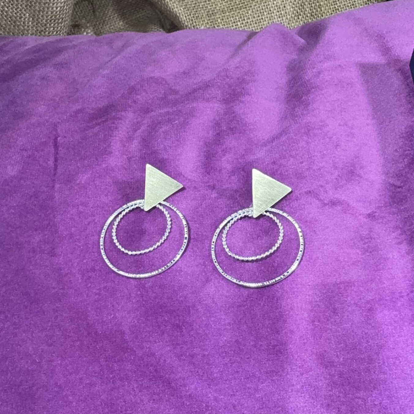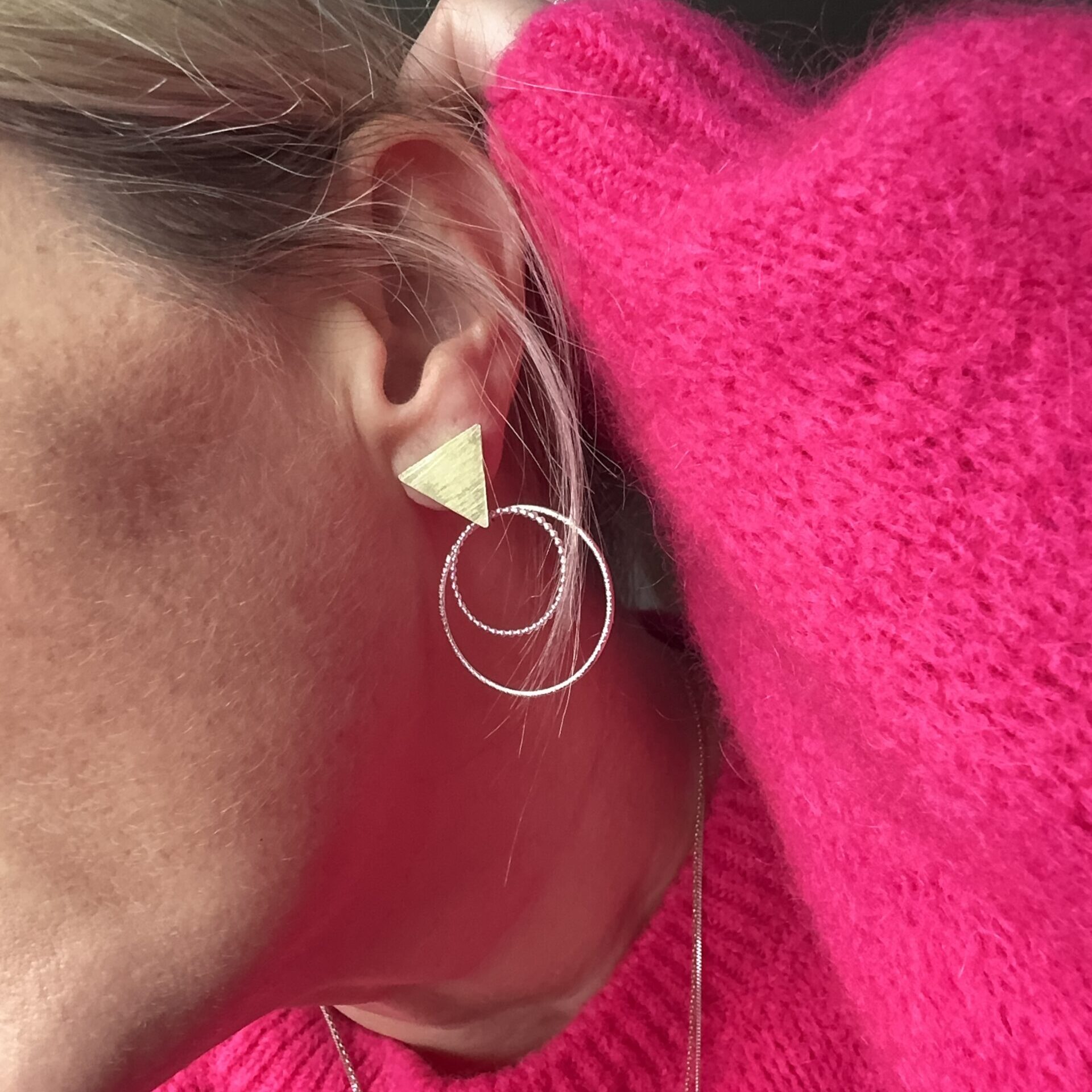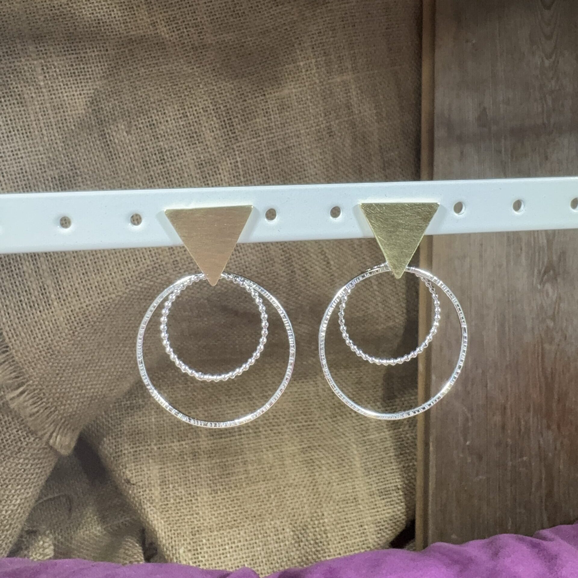 Brass triangles with sterling silver textured large hoops doubled with beaded wire medium hoops.