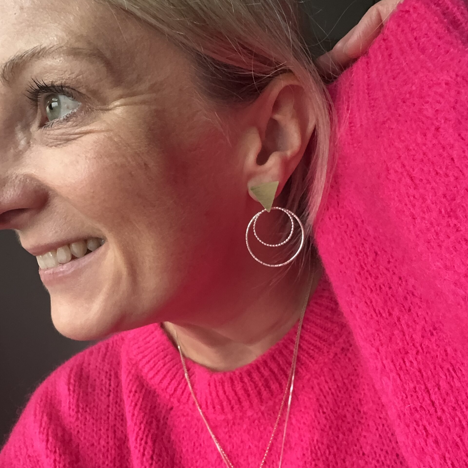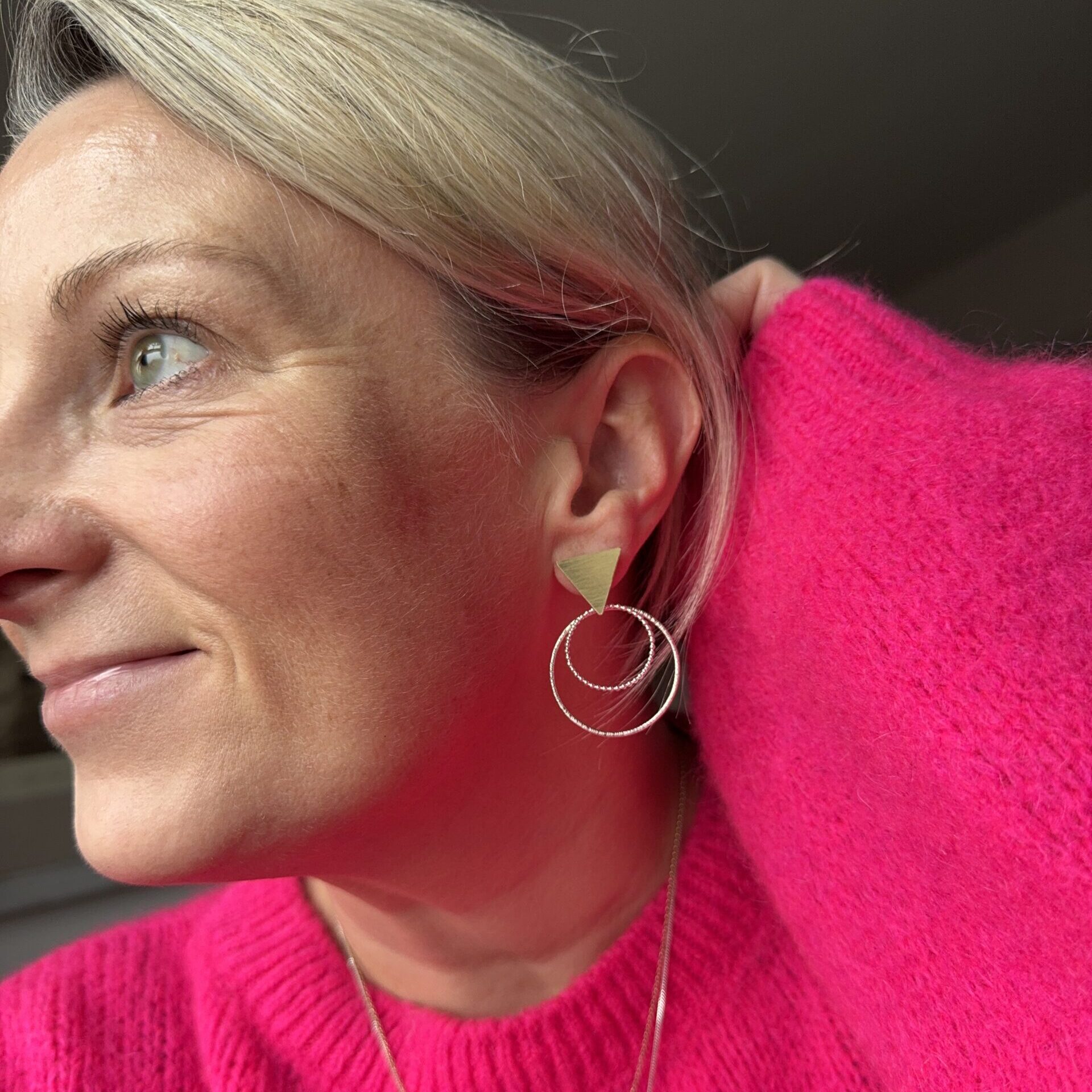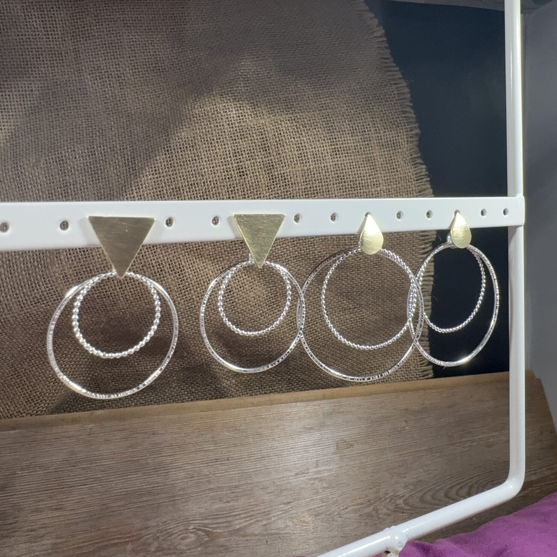 Brass triangles with sterling silver textured large hoops doubled with beaded wire medium hoops.