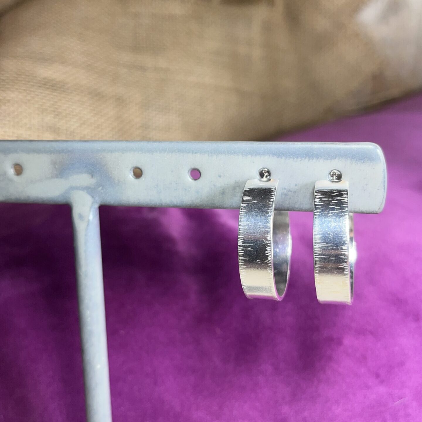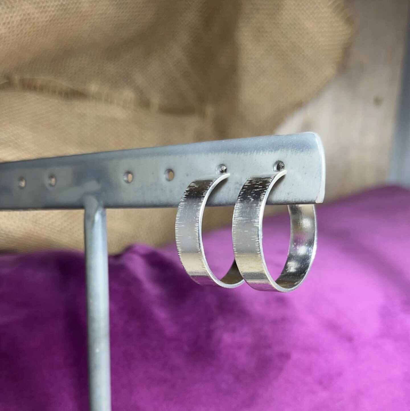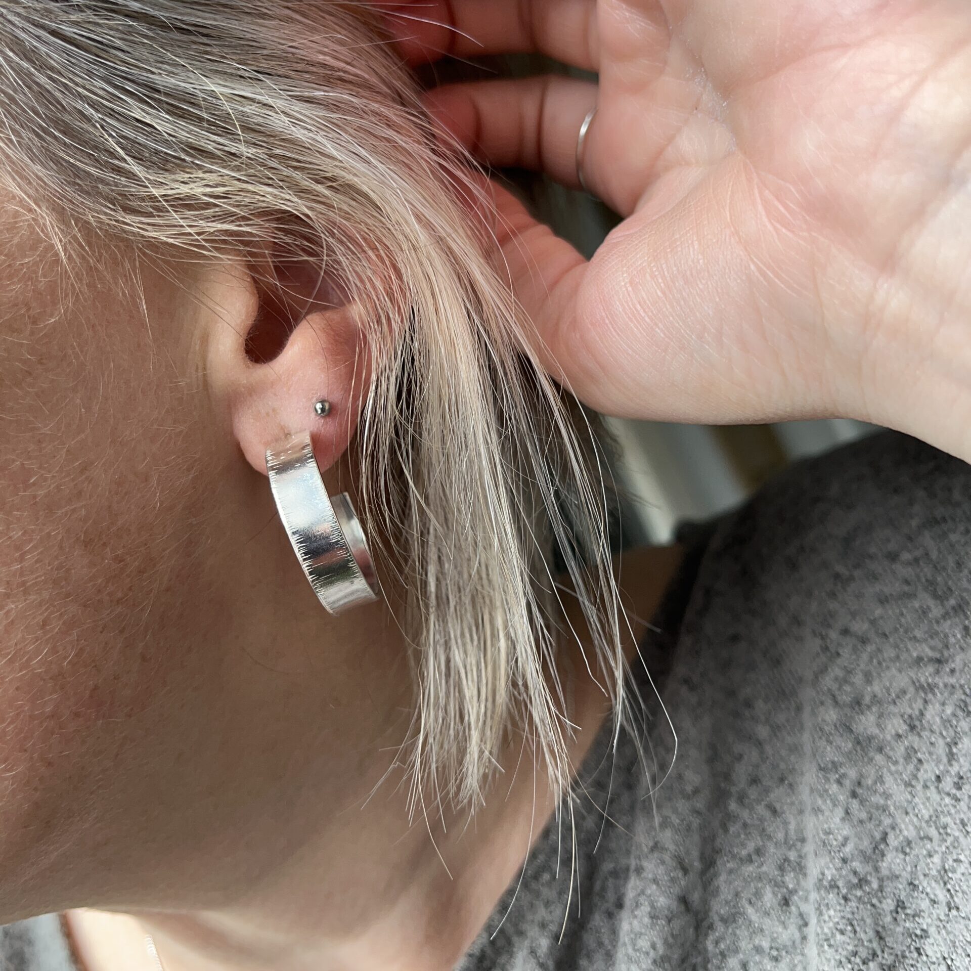 Sterling silver hoops formed from silver sheet and textured with hammered chipping.