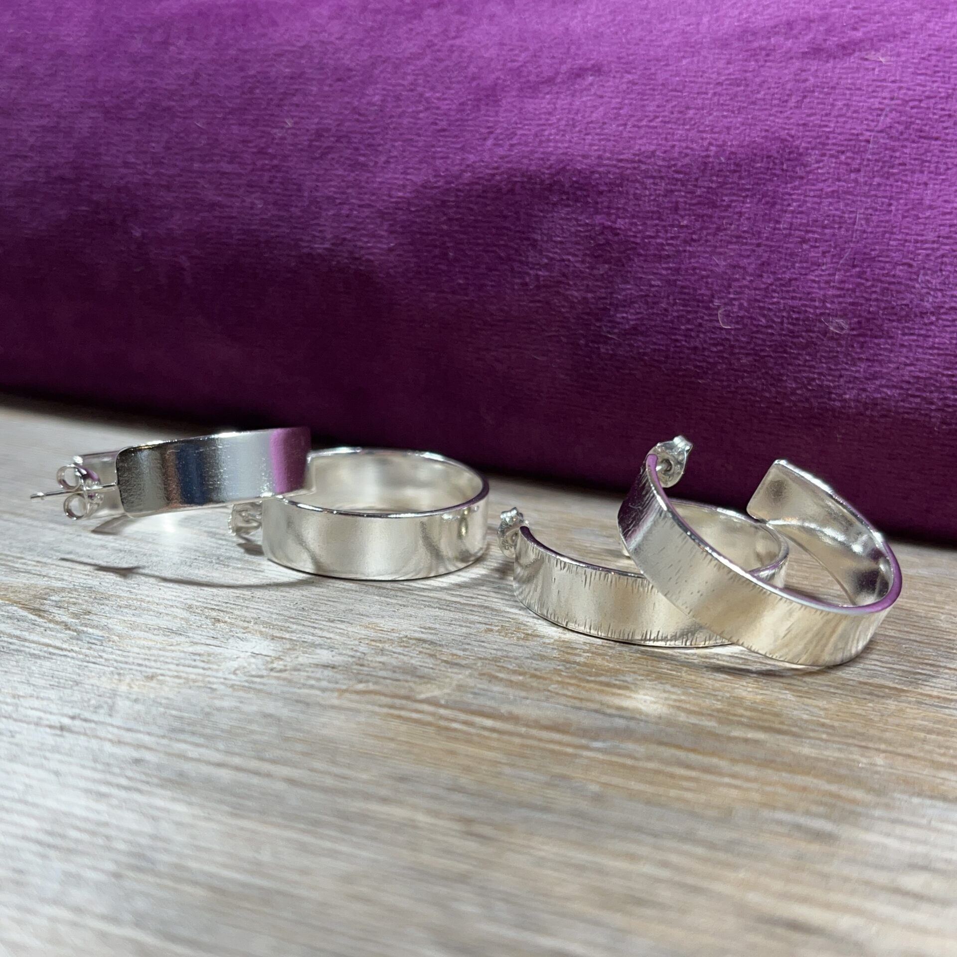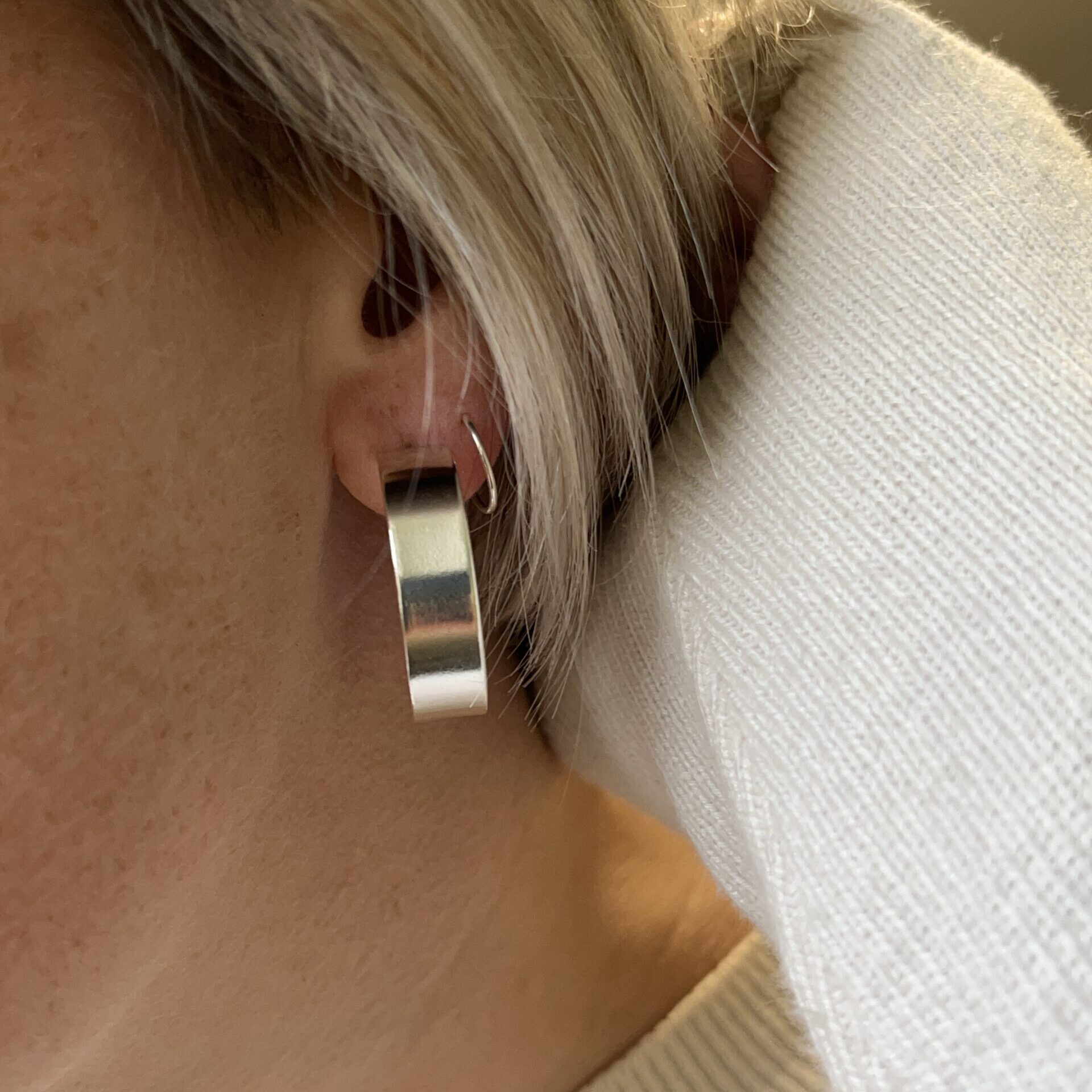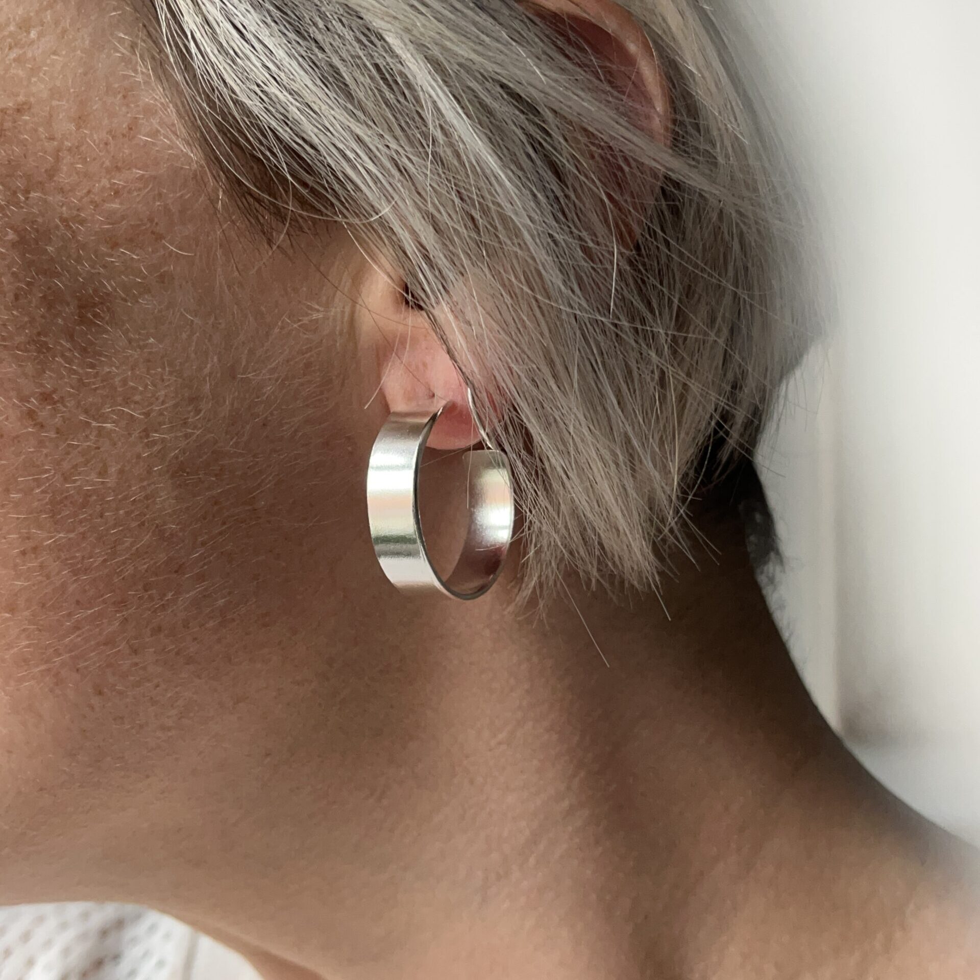 Sterling silver hoops formed from silver sheet with a smooth and shiny finish.